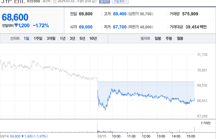JYP Entertainment의 현재 주가는 69,800원으로, 전일 대비 -1,400원 하락했습니다. 주주현황을 살펴보면, 박진영을 포함한 외부인 3인은 지분의 15.95%를 소유하고 있습니다. JYP Entertainment는 미디어 기업으로, 현재 주가는 69,800원입니다. 시가 총액은 2조4375억 원이며, 발행 주식수는 35,532,492주입니다. 외국인 보유 비중은 32.63%이며, 장중 거래량은 572,583주를 기록했습니다. 또한, 매출액은 4,094억 원을 달성했습니다.