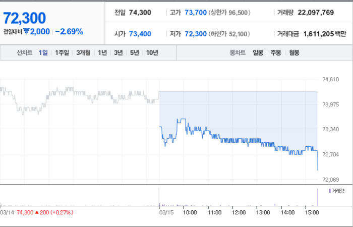 삼성전자의 현재 주가는 72,300원이며 전일 대비 -2,000원의 하락세를 보이고 있습니다. 삼성전자의 대주주인 삼성생명보험(외 15인)은 지분의 20.19%를 소유하고 있습니다.