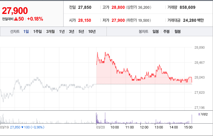 카카오뱅크의 현재 주가는 27,850원이며 전일 대비 -100원 하락한 상태입니다. 주주현황을 살펴보면, 카카오뱅크는 지분의 27.16%를 소유하고 있습니다. 이 은행은 상업은행으로 분류되며, 현재 주가는 27,850원입니다. 시가 총액은 13조3060억 원이며, 발행 주식수는 476,921,137주입니다. 외국인 보유 비중은 16.81%이며, 장중 거래량은 806,241주입니다. 또한 매출액은 8,047억 원을 기록했습니다.