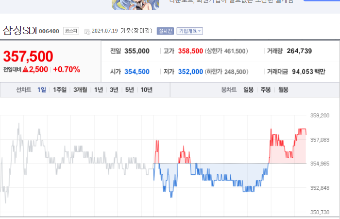 삼성SDI 주가는 현재 357,500원으로 전일 대비 -8.92원 하락했습니다. 삼성전자(외 4인)은 삼성SDI의 주주 중 20.52% 소유하고 있습니다. 회사는 전자 장비 및 기기 분야에 종사하며 시가 총액은 24조5833억 원이고 발행 주식수는 68,764,530주입니다. 외국인 보유 비중은 39.11%이며 장중 거래량은 267,075주입니다. 삼성SDI의 매출액은 51,309억 원을 기록했습니다.