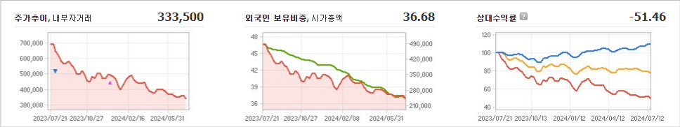 LG화학의 현재 주가는 333,500원이며 전일 대비 -7.23원 하락했습니다. LG화학의 대주주인 LG(외 1인)은 지분의 33.37%를 소유하고 있습니다. 회사는 화학 기업으로 시가 총액은 23조5425억 원이며 발행 주식수는 70,592,343주입니다. 외국인 보유 비중은 36.68%이고 거래량은 303,750주입니다. LG화학은 매출액으로 116,094억 원을 기록했습니다.
