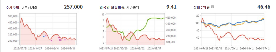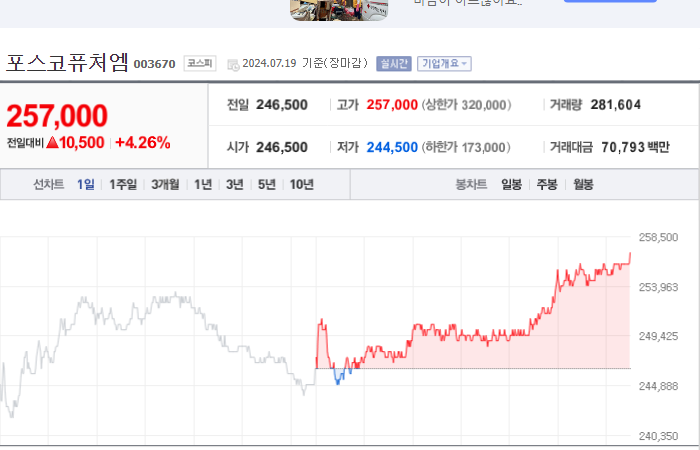 포스코퓨처엠의 현재 주가는 257,000원이며 전일 대비 -3.93원 하락했습니다. 주주현황을 살펴보면 포스코홀딩스(외 4인)이 지분 62.54%를 보유하고 있습니다. 화학 기업인 포스코퓨처엠의 시가 총액은 19조9080억 원이며 발행 주식수는 77,463,220주입니다. 외국인 보유 비중은 9.41%이며 거래량은 283,932주를 기록했습니다. 이 회사의 매출액은 11,384억 원을 기록했습니다.