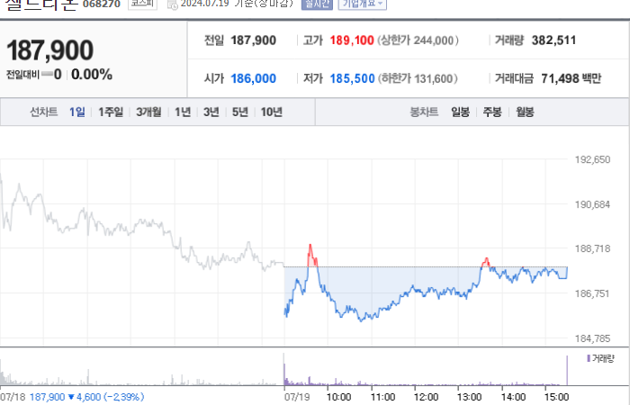 셀트리온의 현재 주가는 187,900원으로 전일 대비 상승했습니다. 주요 주주로는 셀트리온홀딩스(외 86인)가 지분의 28.29%를 보유하고 있습니다. 이 회사는 바이오 기업으로 시가 총액은 40조7730억 원이며 발행 주식수는 216,993,223주입니다. 외국인 보유 비중은 22.97%이며 거래량은 400,415주입니다. 매출액은 7,370억 원을 기록했습니다.