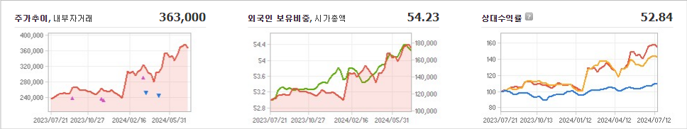 삼성화재 주가는 현재 363,000원이며 전일 대비 -4,000원 하락했습니다. 주주 구성을 살펴보면 삼성생명보험(외 6인)이 18.50%의 지분을 보유하고 있습니다. 삼성화재는 보험 기업으로서 시가 총액은 17조1971억 원이며 발행 주식수는 47,374,837주입니다. 외국인 보유 비중은 54.23%이며 장중 거래량은 85,916주를 기록했습니다. 또한 매출액은 55,068억 원을 기록했습니다.