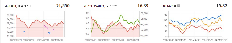 다음은 대한항공에 대한 정보입니다. 현재 대한항공의 주가는 21,550원이며 전일 대비 -550원 하락했습니다. 한진칼(외 27인)이 대한항공의 지분의 30.37%를 소유하고 있습니다. 대한항공은 항공운수 기업으로서 시가 총액은 7조9352억 원이고 발행 주식수는 368,220,661주입니다. 외국인 보유 비중은 16.39%이며 장중 거래량은 1,354,185주입니다. 또한, 대한항공은 매출액으로 42,914억 원을 기록했습니다.